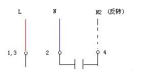 當兩繞組完全一樣,電機可能是三端子接線,1,3為兩繞組的公共接線端,接交流電源的L, 2/4端子之間聯有啟動電容, 如果交流電源的N端接端子2為正轉,則N改接端子4為反轉;如果是四端子,見圖四接線;